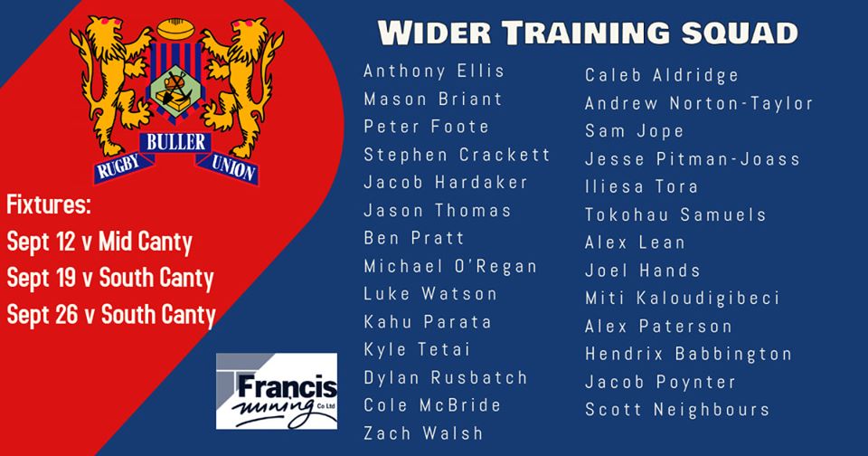 The following players have been named in the wider Buller Heartland training squad to compete in the South Island series against Mid Canterbury and South Canterbury in September.