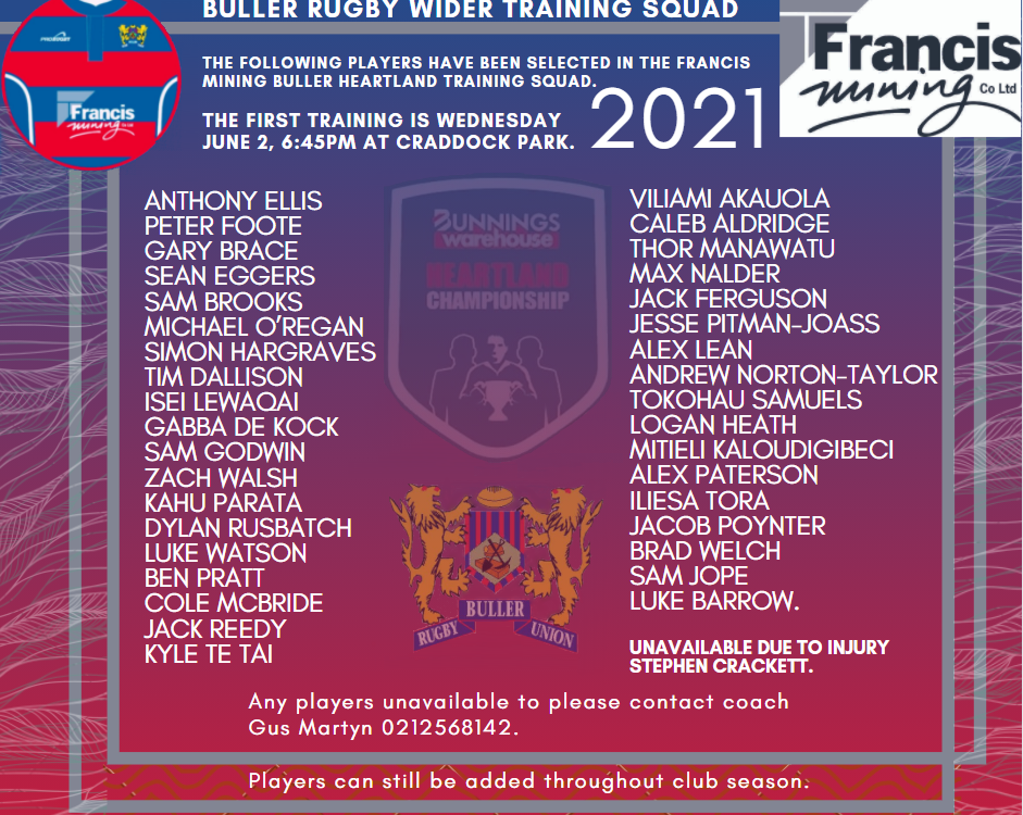 The following players have been selected in the Francis Mining Buller Heartland training squad. The first training is Wednesday June 2, 6:45pm at Craddock Park.