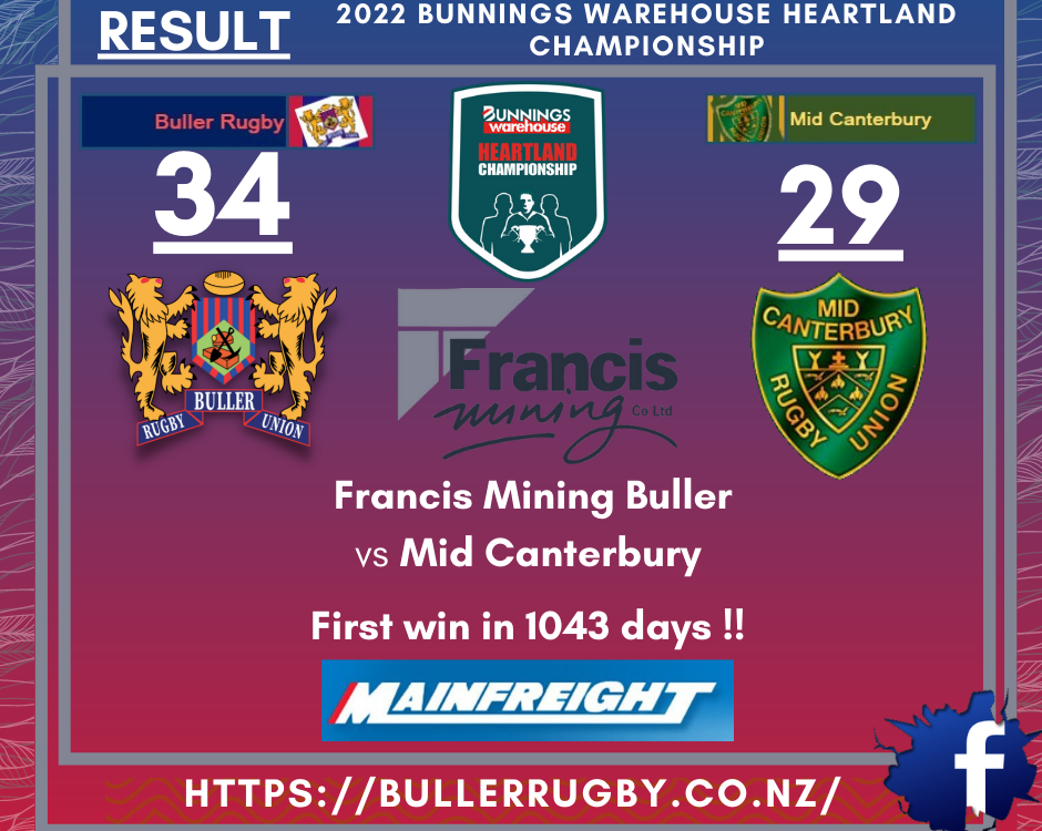 Francis Mining Buller have made the best possible start to their Bunnings Warehouse Heartland Championship campaign with a highly impressive 34-29 win over Mid Canterbury on Saturday. Buller, who last won a game 1043 days ago, were not expected to cause too many problems against a formidable Mid Canterbury side, however the home side produced a determined and courageous 80 minutes of rugby in front of a healthy local crowd.