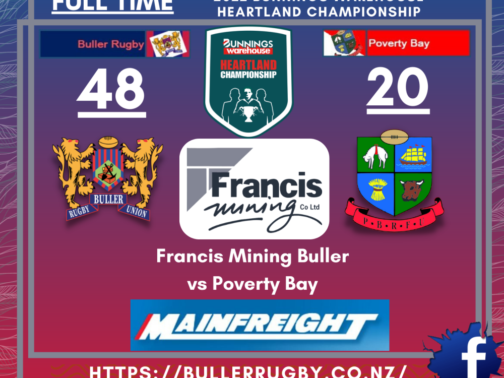Francis Mining Buller have scored back-to-back home victories in the Bunnings Warehouse Heartland Championship after they beat Poverty Bay 48-20 at Victoria Square on Saturday. Buller produced a clinical performance in the round 3 fixture scoring 7 tries on route to claiming the maximum five competition points which has them sitting in third equal position on the standings.