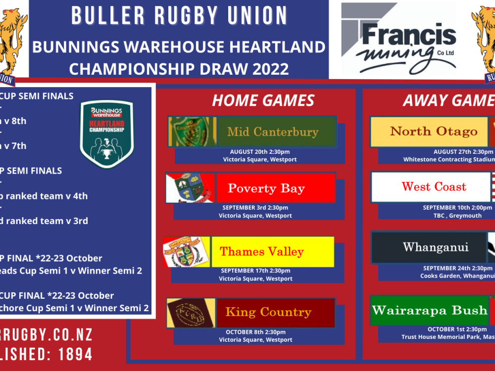 Following a unique season in 2021, which included All Blacks great Ma’a Nonu playing for East Coast and current All Blacks captain Sam Cane taking the field for King Country, the Bunnings Warehouse Heartland Championship will kick off in Westport on 20 August where Buller will play Mid-Canterbury. The Bill Osborne Taonga, introduced in 2021, will be defended for the first time by Poverty Bay, who will play Wairarapa Bush on 27 August at Rugby Park in Gisborne
